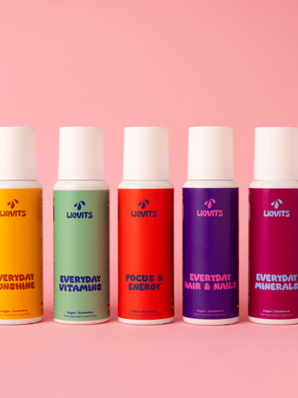 Aktuell gibt es 8 LiqVits für 8 verschiedene Anwendungsziele von der täglichen Vitamin- und Nährstoffversorgung über natürliches Koffein und Melatonin zu Darmkulturen, Vitamin D3 bis hin zu Beauty-Komplexen für Haut, Haare & Nägel.