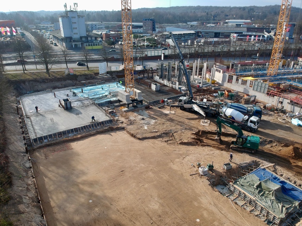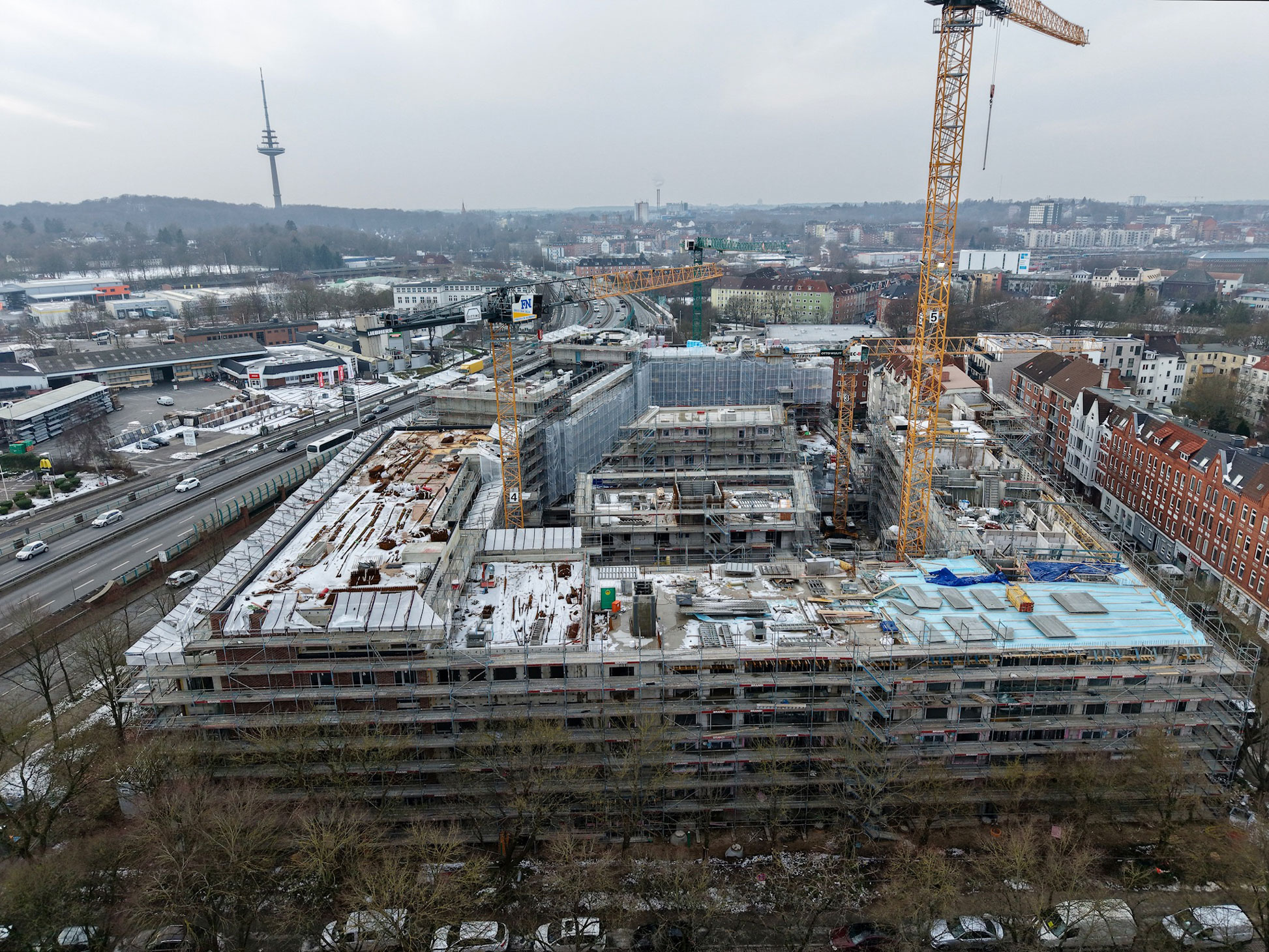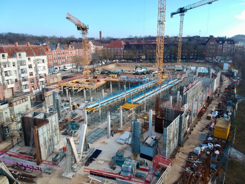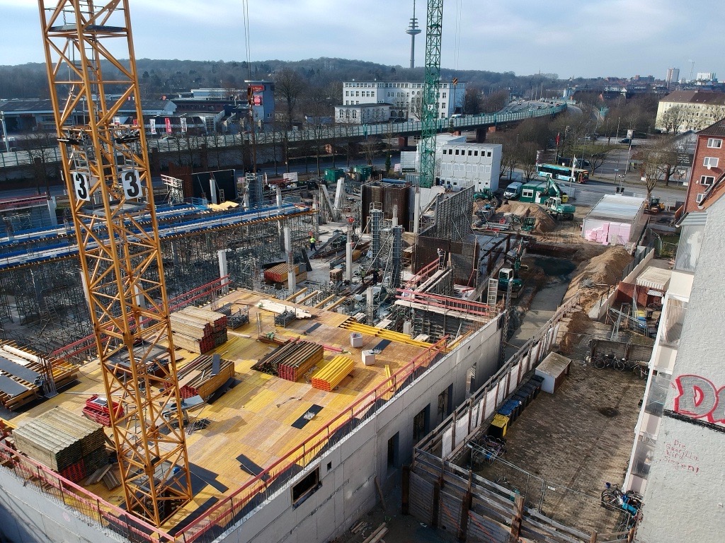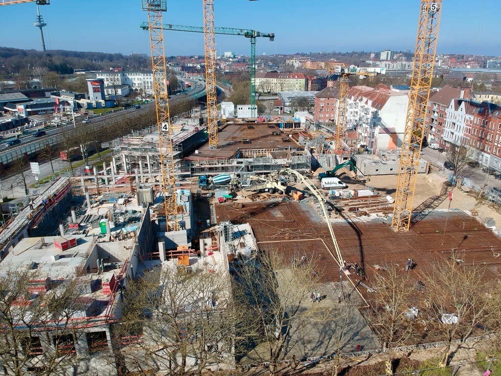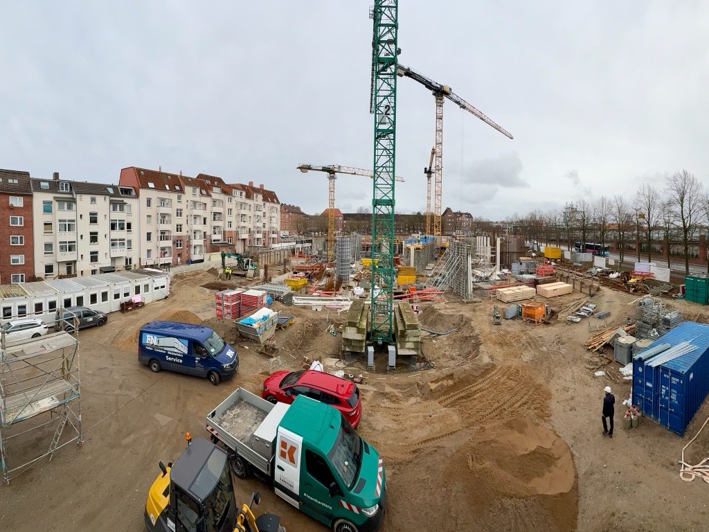 Sieh durch unsere Baustellenkamera tägliche Fotoaufnahmen des wachsenden coop Stammhausquartiers in der Kieler Sörensenstraße.