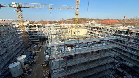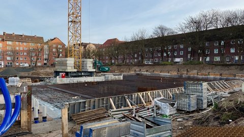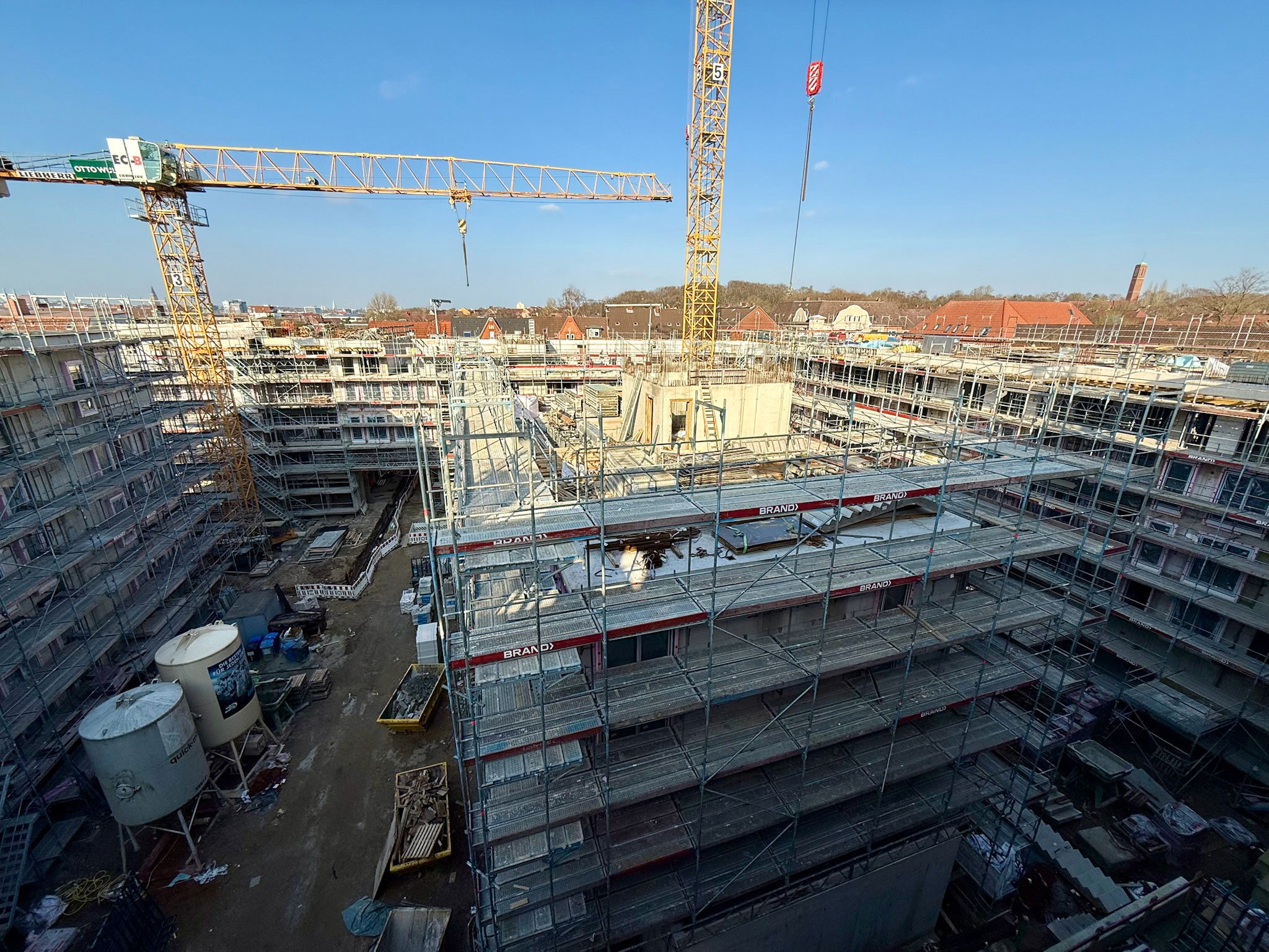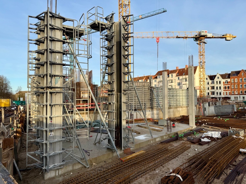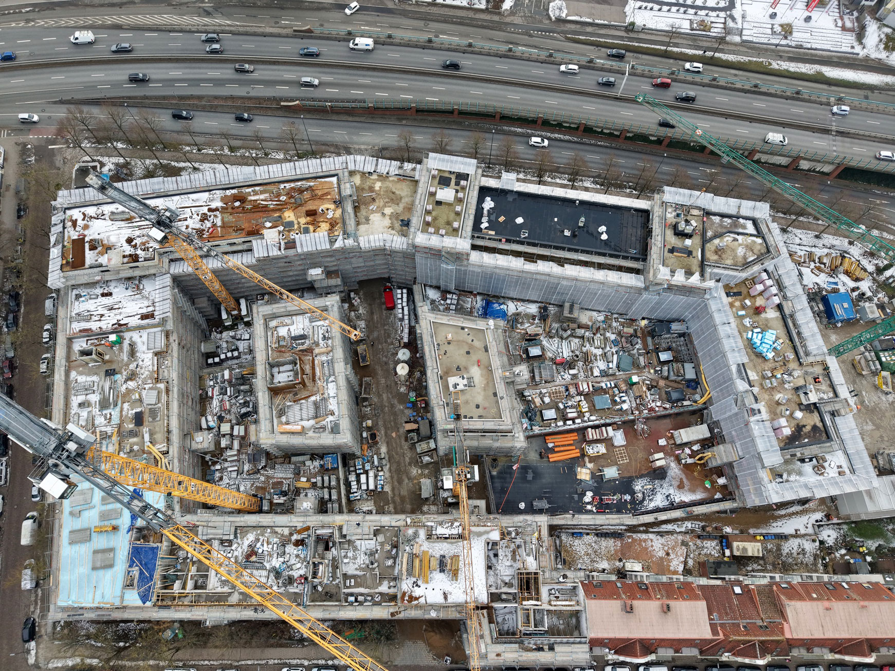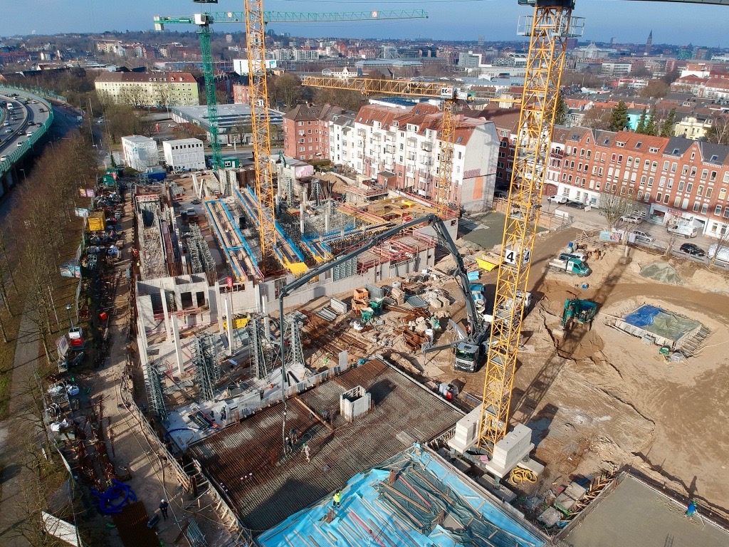 Sieh durch unsere Baustellenkamera tägliche Fotoaufnahmen des wachsenden coop Stammhausquartiers in der Kieler Sörensenstraße.