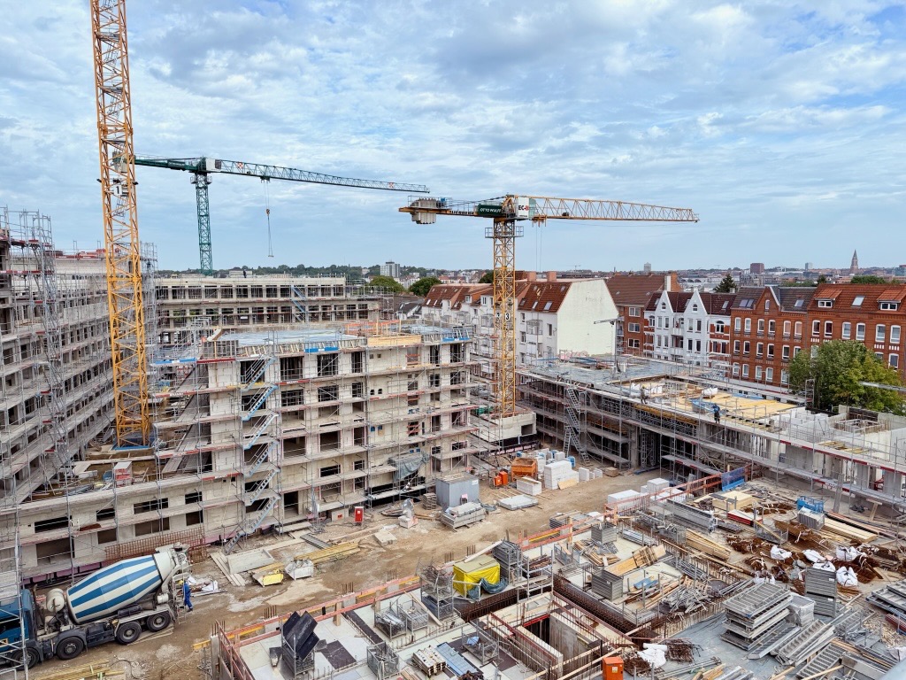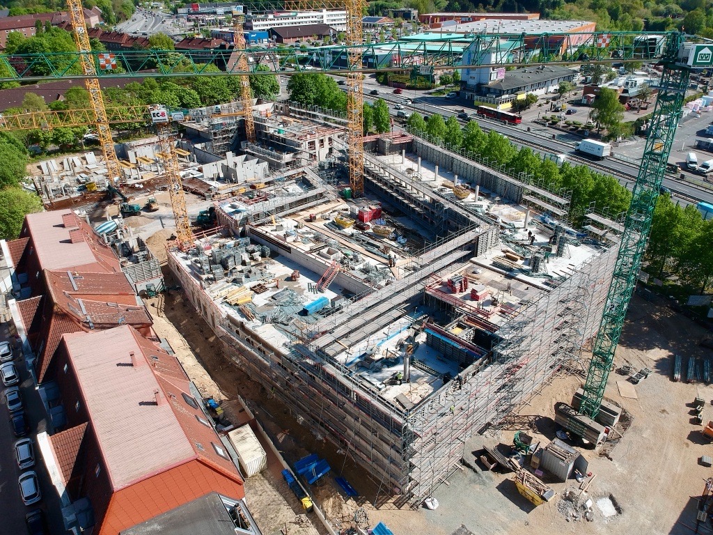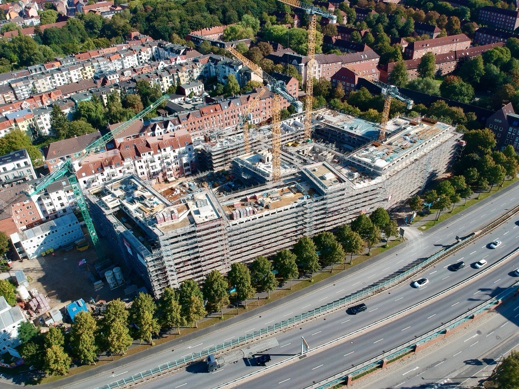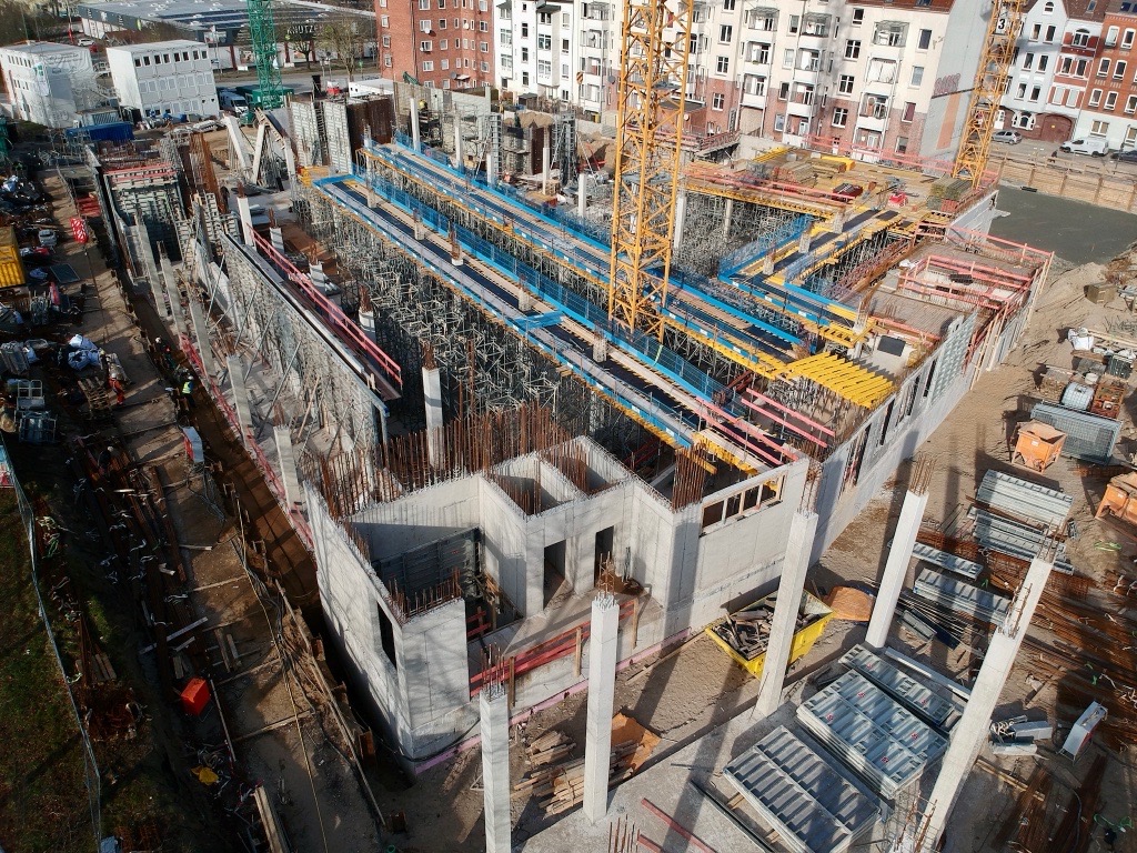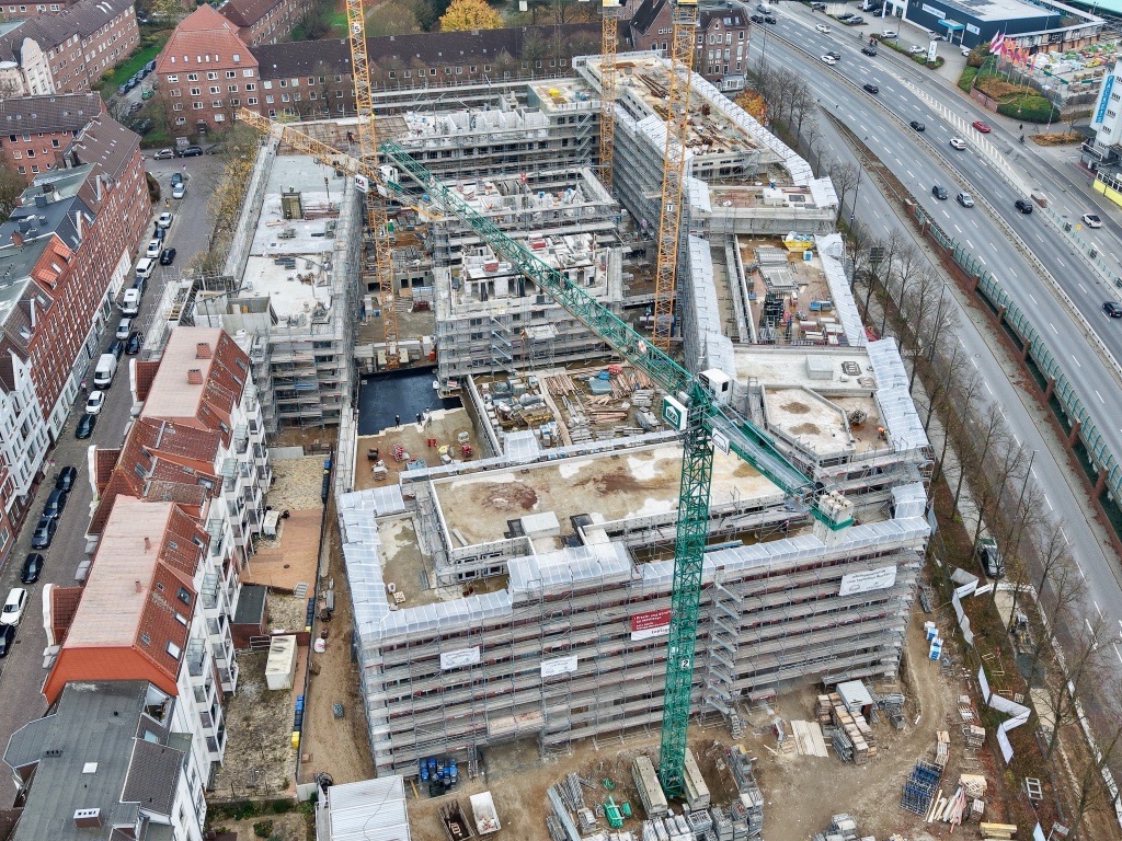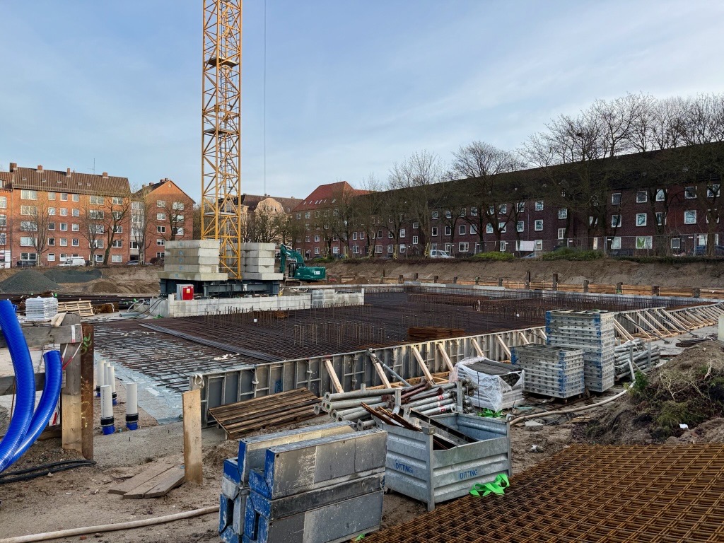 Sieh durch unsere Baustellenkamera tägliche Fotoaufnahmen des wachsenden coop Stammhausquartiers in der Kieler Sörensenstraße.