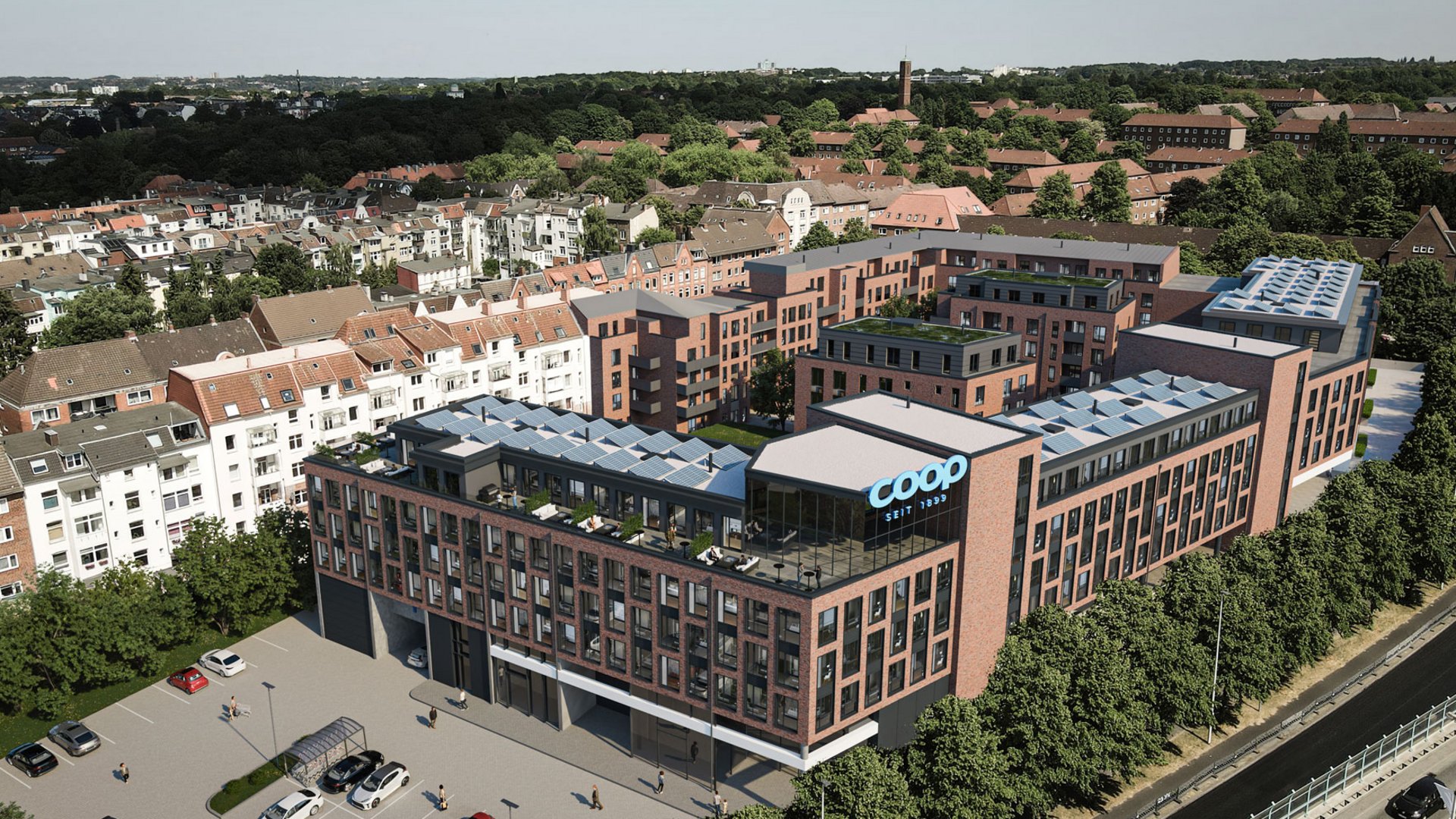 Neu errichteter Stammsitz der coop eG | 6.400 m² Wohnfläche | 13.000 m² Gewerbefläche | Modernster REWE Markt Kiels | Kindertagesstätte | Inklusives & Betreutes Wohnen | Tagespflege | Ärztehaus | Büroflächen | Tiefgarage